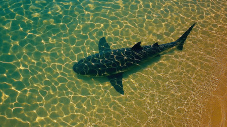 A stunning view of a shark swimming gracefully in clear shallow water, showcasing the beauty of tropical marine life under sparkling sunlight.
