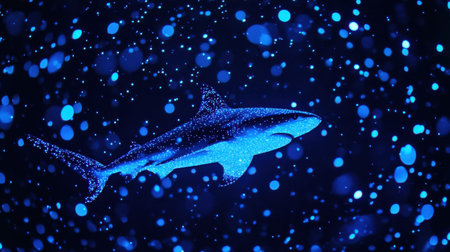 A striking depiction of a shark silhouette surrounded by sparkling blue bubbles against a dark ocean background, creating a captivating and serene scene.