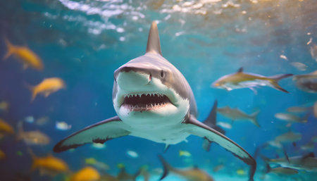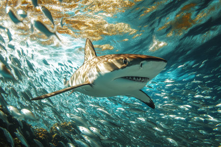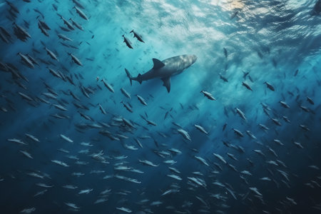 Shark swimming amidst fish school, ocean, underwater wildlife, nature documentary