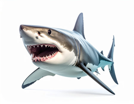 Close-up of a great white shark with its jaws slightly open, isolated on a white background, showcasing its fierce, majestic appearance
