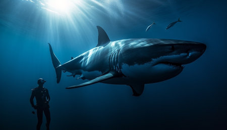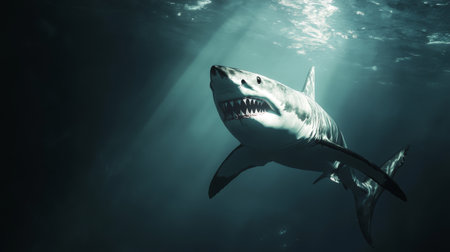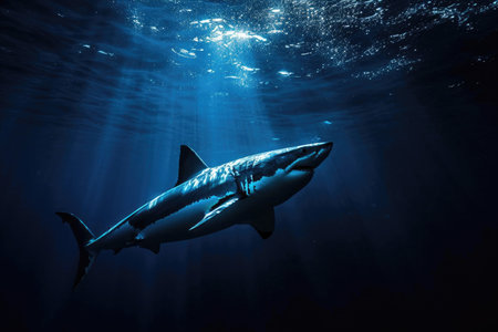 Majestic great white shark swimming in the ocean depth with sunlight filtering through the water