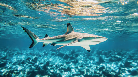 A stunning close-up image of a shark swimming gracefully through clear, vibrant waters, capturing the beauty and power of marine wildlife in its natural habitat.