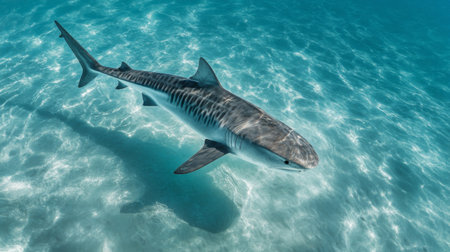 A stunning tiger shark glides effortlessly through the clear ocean water, showcasing its distinctive patterns. The tranquil scene captures the beauty of marine wildlife and the serene underwater world.