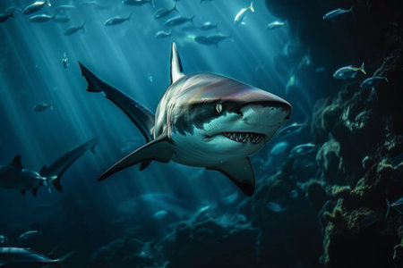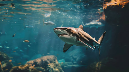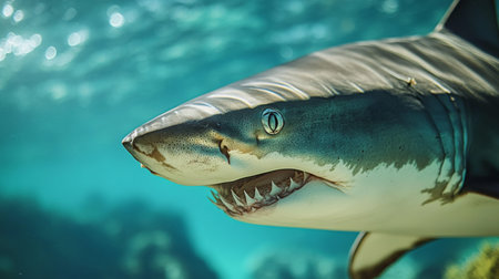 Menacing beauty: underwater world with the shark predator, a captivating glimpse into the fierce, powerful, and mysterious realm of marine life, where danger and elegance coexist.