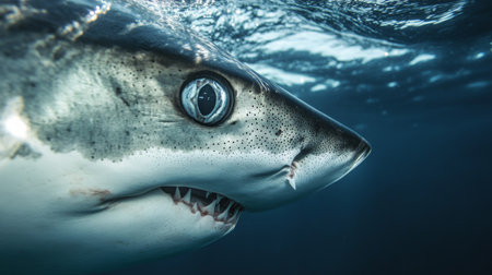 A striking close-up view of a shark swimming gracefully through clear ocean waters, showcasing the beauty and power of marine life in its natural habitat.