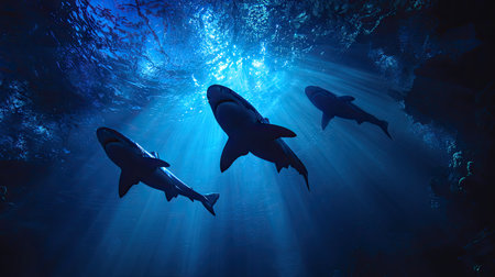 This image features three sharks gliding through the ocean depths. The composition highlights their silhouettes against the bright sunlight filtering down. The scene showcases a cool blue color palette with textured water. Suitable for various editorial and commercial applications, the image evokes a sense of aquatic life.