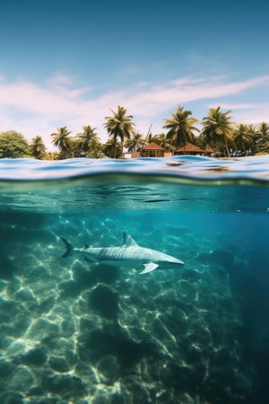 underwater and surface world. sharks against the backdrop of a vibrant coral reef teeming with marine biodiversity, with an island paradise on the surface.