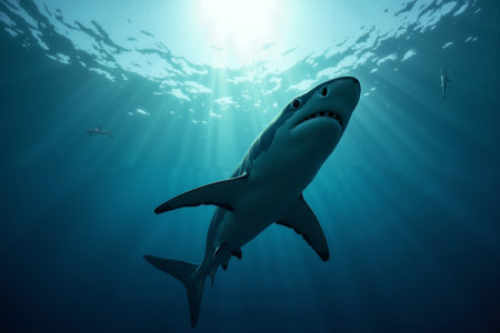 Great white shark swimming underwater with sunlight, ocean wildlife concept
