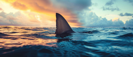 A striking image capturing a shark fin breaking the surface of the ocean at sunset, with vibrant colors illuminating the water. The serene atmosphere evokes a sense of adventure and connection to nature.