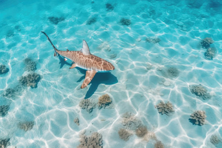 Generative AI : Aerial View of a lone Lemon Shark hunting in the shallow waters of a sand flat Berry Islands the Bahamas
