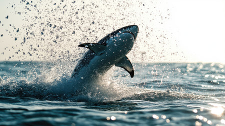 A spectacular moment captured as a shark breaches the ocean surface, creating a dynamic splash in sunlight. The image showcases marine wildlife in action.