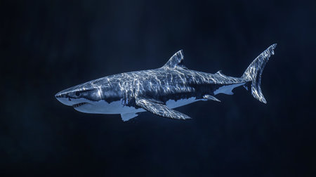 A great white shark swimming gracefully in the moonlit waters