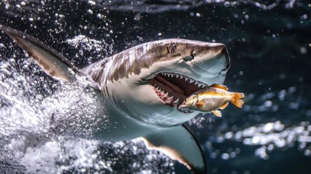 Shark with open mouth emerges out off the water on the surface and grabs bait. Attacking Great White Shark in the water of the ocean. Great White Shark, scientific name: Carcharodon carcharias.
