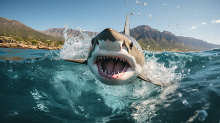 Great white shark breaching water surface at sunset mountains