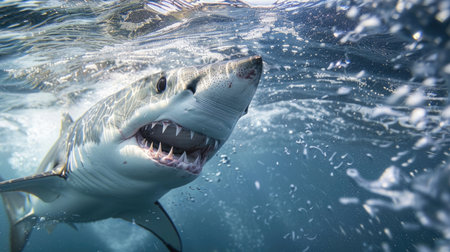 Great White Shark near by water surface. Underwater wildlife shot.