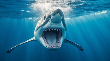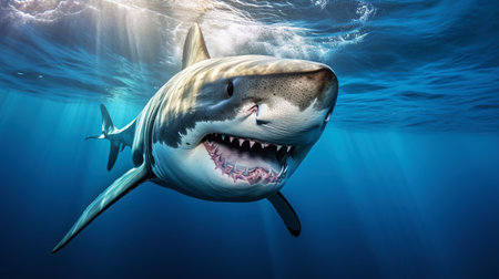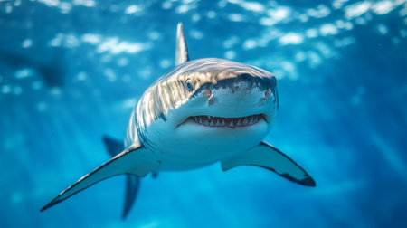 A stunning close-up view of a great white shark swimming in the deep blue ocean, showcasing its sharp teeth and powerful presence with sunlight filtering through the water.