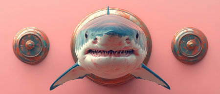 A realistic shark mount displayed on a pink wall, showcasing unique artistic flair and contemporary design elements.