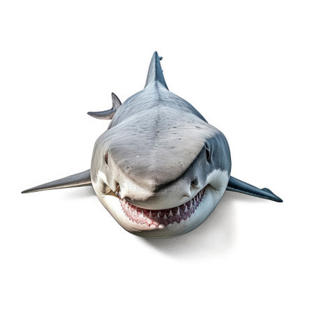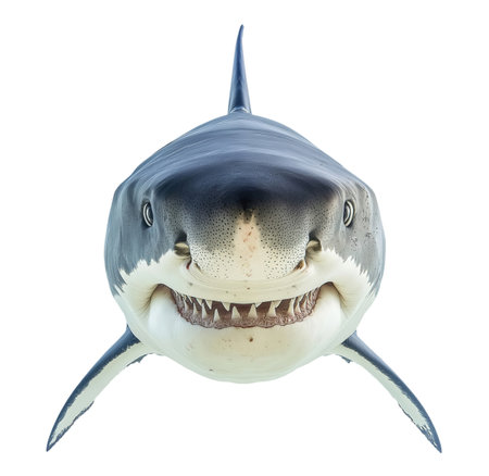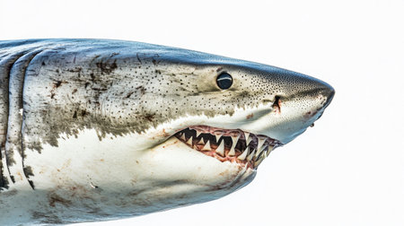 Close-up of a great white shark with its jaws slightly open, isolated on a white background, showcasing its fierce, majestic appearance