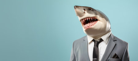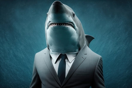 Professional business shark in formal suit holding briefcase, representing corporate success and aggressive sales strategies in modern workplace.