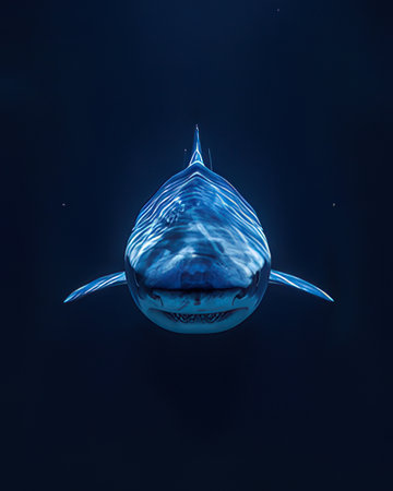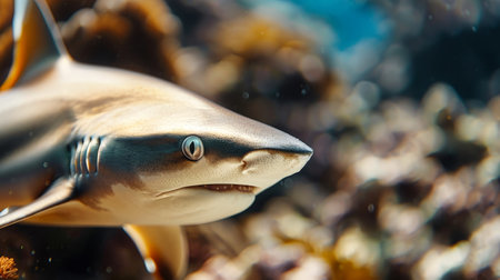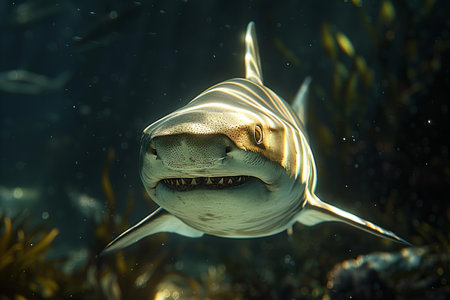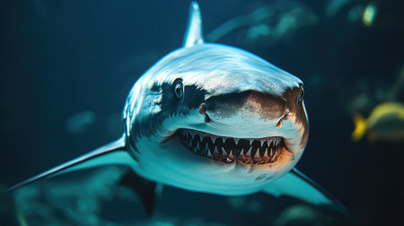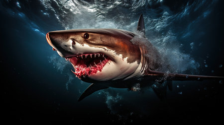Menacing beauty: underwater world with the shark predator, a captivating glimpse into the fierce, powerful, and mysterious realm of marine life, where danger and elegance coexist.