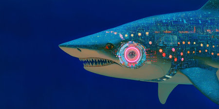 Digital Shark Futuristic Cybernetic Marine Creature Concept Art.