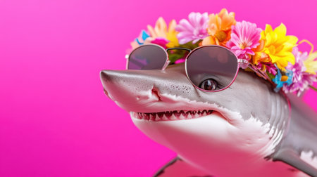 Playful shark smiling in stylish sunglasses and floral crown, floating against a bright pink backdrop