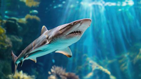 A striking image of a shark gliding through clear ocean water, surrounded by vibrant marine life. Sunlight beams illuminate the serene underwater scene, capturing the beauty of ocean habitats and the elegance of this ocean predator.