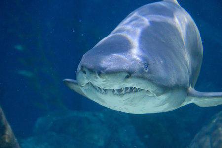 Scary shark floats on the ocean floor.