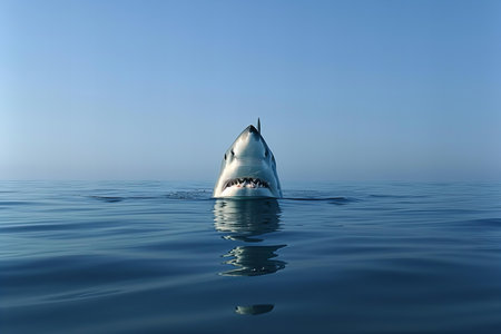 Dynamic depiction of a great white shark breaking the ocean surface, showcasing its formidable presence and sharp teeth. this striking scene conveys themes of power and dominance, making it ideal for bold sports brand advertising.