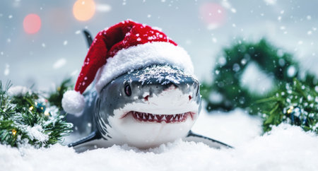 Smiling shark wearing santa hat in snowy winter scene