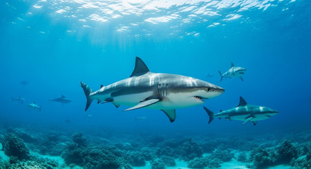 A group of magnificent sharks gracefully swims in the azure ocean, showcasing their breathtaking beauty in the mesmerizing world underwater