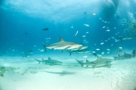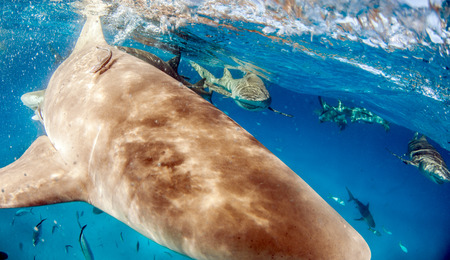 Picture shows Caribbean reef sharks and lemon sharks at the Bahamas