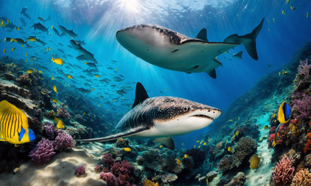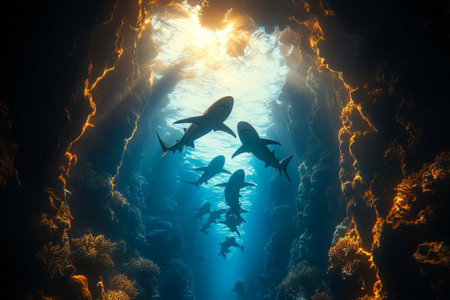 Sharks swimming in ocean cave, sunlight above, coral reef background