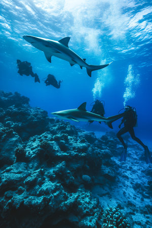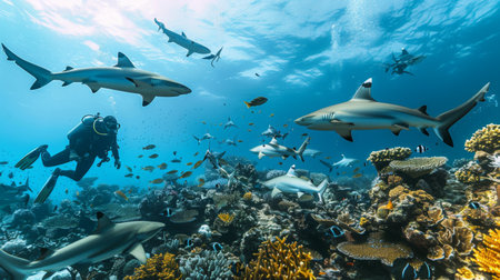 A diver observing a school of reef sharks swimming in a coral reef ecosystem, showcasing the beauty and diversity of marine life.