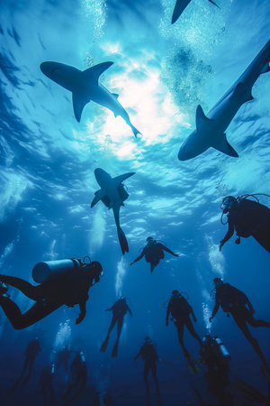 Scuba divers enjoy an exhilarating experience as they swim alongside a stunning shark in bright, clear ocean waters, surrounded by light.