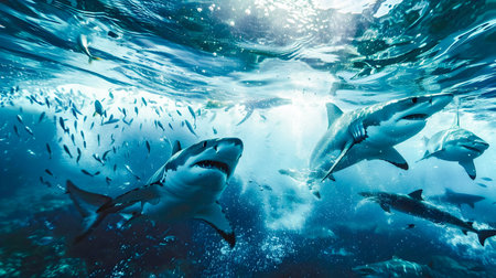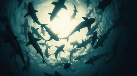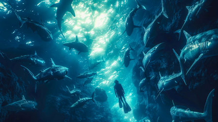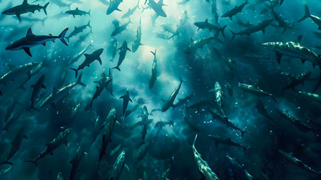 A dramatic underwater view of numerous sharks swimming in the ocean with light rays piercing through the surface. symbolizing the power and mystery of marine life..