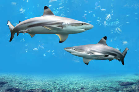 Blacktip Reef sharks swimming in tropical waters over coral reef