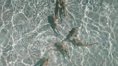 A serene view of sharks swimming in clear tropical waters near a sandy beach. The calm environment captures marine life in a beautiful coastal scene.