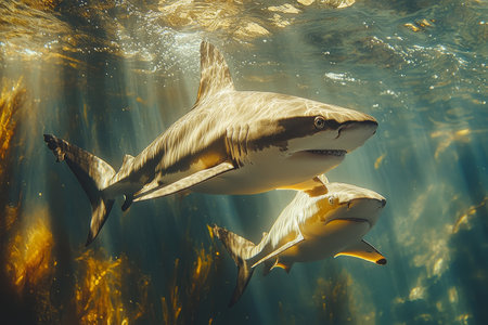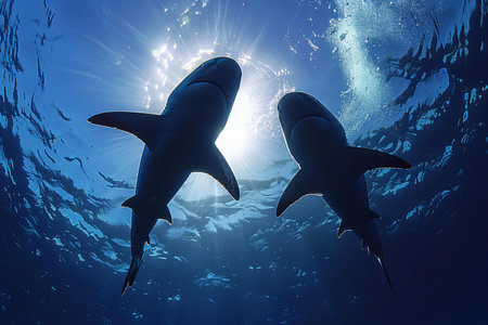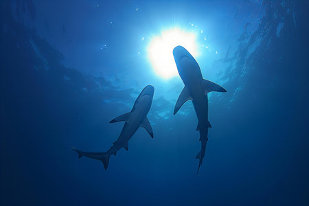 Silhouette of two sharks swimming in the deep blue ocean, sunlight shining through the water surface in a low angle view with sunlight rays, underwater photography with sharp focus on the subject in high resolution and high quality with high detail in a hyper realistic and super detailed style with