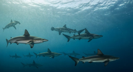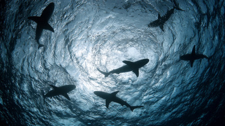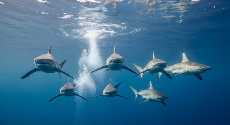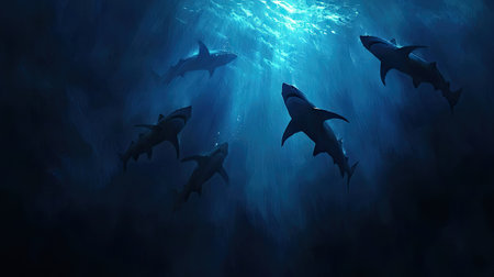 A group of sharks swimming silently through deep blue waters, creating an awe-inspiring, slightly eerie underwater scene.