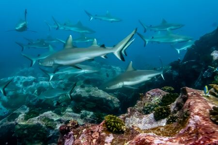School of Grey reef sharks (Carcharhinus amblyrhynchos) over the rock reef in Marianne Island, Seychelles