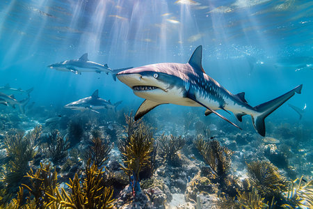 A shark swimming over the reef with other sharks in it, underwater photography, sun rays through the water surface, wide shot, full body,