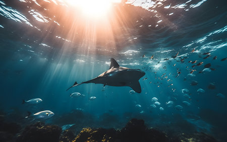 Shark swimming underwater with sunlight filtering through blue ocean surface, marine wildlife scene. Underwater exploration and marine conservation concept