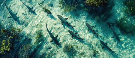 Generative AI : Aerial view of a sharks freely swimming in open water