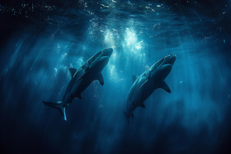 Depicting a silhouette of two sharks swimming in the deep blue ocean, with sunlight filtering through the water and creating light rays on their bodies. the background is dark to highlight them, and there's some mist around for an ethereal effect.