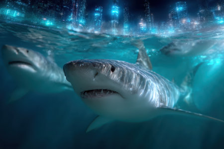 Two sharks glide through water near a luminous city skyline, creating an intriguing aquatic atmosphere.