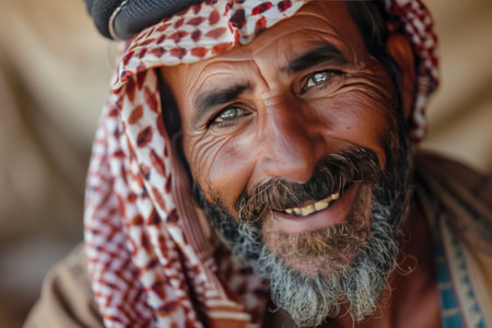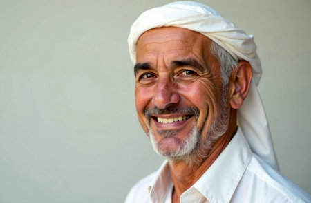 Happy senior Middle Eastern man in traditional headscarf smiling at the camera