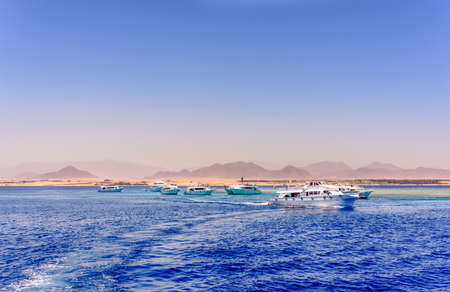 White yachts tourists in Bay Akaba background Red sea and Tiran Kingdom Saudi Arabia, island near Sharm El Sheikh in Egypt