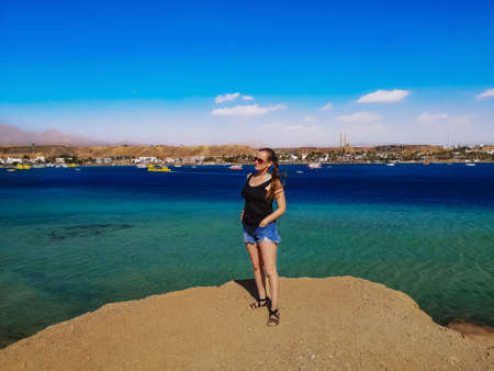 Young pretty woman stands on a rock against the background of Sharm el-Maya bay in Sharm El Sheikh (Egypt). Adult caucasian girl against the backdrop of the azure water of the Red Sea