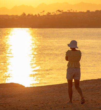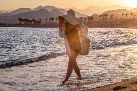 Sharm El Sheikh, Egypt May 10, 2019: A man with a camera walking along the sea beach.